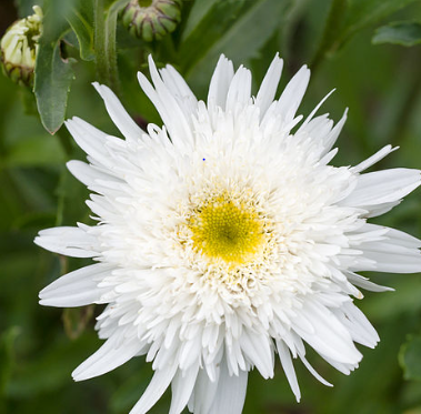 Cette ravissante variété de marguerite d’automne forme une masse composée de nombreuses tiges. Les feuilles épaisses et luisantes sont d’un beau vert franc. En fin d’été de ravissantes fleurs très doubles et blanc pur se dressent et laissent apparaître un jolie cœur jaune d’or.
